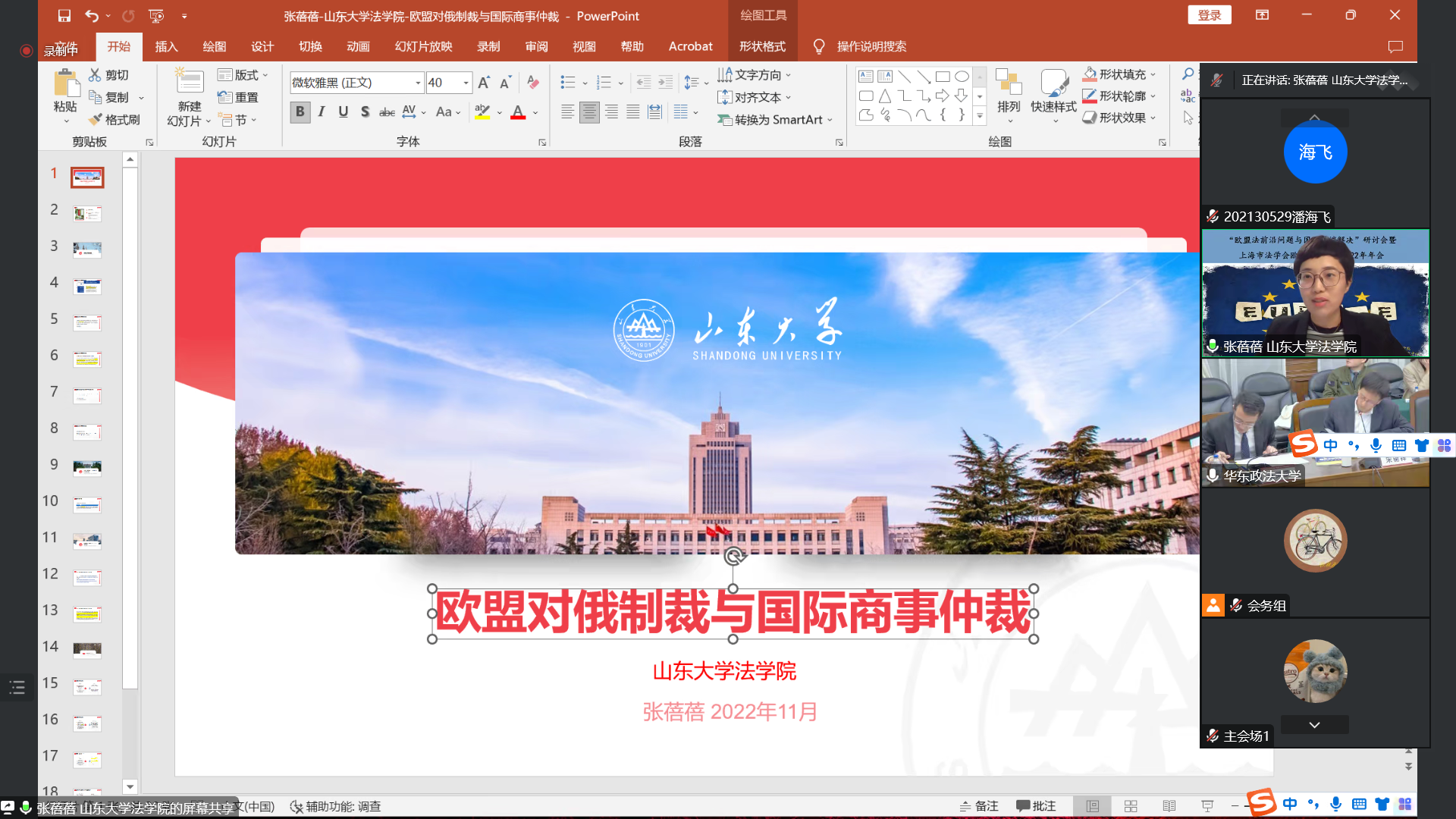 会议分两个单元:“欧盟法前沿问题论坛”和“欧盟与国际争端解决”。张蓓蓓博士受邀参加第二单元的讨论,向会议作了题为《欧盟对俄制裁与国际商事仲裁》的报告。她首先介绍了欧盟对俄制裁的最新发展及其对国际商事仲裁的影响,而后重点分析欧盟制裁法中的“仲裁排除机制”,并说明该机制对中国涉外法治建设的参考价值。报告涉及欧盟法院及非欧盟国家法院的相关最新案例。来自上海交通大学、西南政法大学、微创投资控股有限公司的学者和实务专家对张蓓蓓博士的报告进行点评。