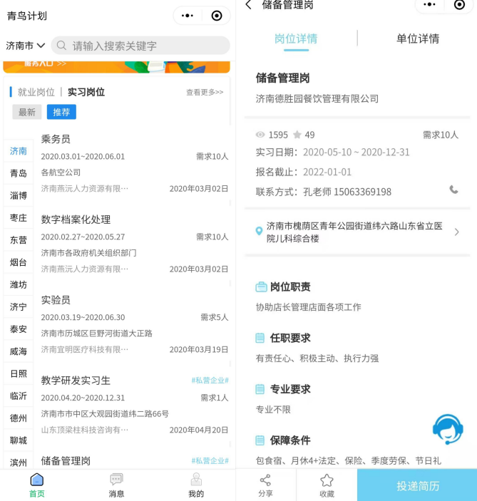 1. “青鸟计划”小程序上公布的所有岗位均可视自身情况投递简历并报名,部分地市尚有未公布的实习岗位,同学们可持续关注“青鸟计划”小程序的岗位发布情况。