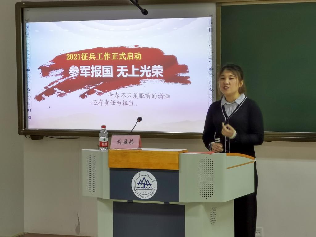 刘盈弟结合自身经历,通过图片与视频的形式向同学们展现部队训练和生活情况,表示正是规律健康的军旅生活,使自己收获了远大的理想信念、干练的工作风格和良好的行为习惯她从基本条件、基本流程、优惠政策等方面系统介绍了应征入伍的基本概况,分享了大学生入伍前和退伍后的变化,并对有入伍意向的同学提出建议,鼓励同学们投身于伟大的国防事业,让青春在军营的历练中、在为祖国的奉献中闪光。